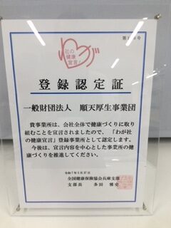 じゅんてんブログ 全国健康保険協会の「わが社の健康宣言」登録認定を受けました。 2025年9月10日おしらせ この度、当事業団では事業所が自社の健康づくりの取り組み目標を社内外に宣言し、健康課題の解決に取り組むことをねらいとして実施されている全国健康保険協会(協会けんぽ)の「わが社の健康宣言事業」に参加申請を行い登録事業所として認定を受けました。 « 夏季休業日のお知らせ じゅんてんだより10月号発行のお知らせ »
